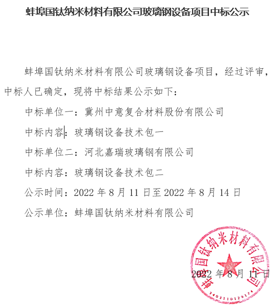 蚌埠國(guó)鈦納米材料有限公司玻璃鋼設(shè)備項(xiàng)目中標(biāo)公示