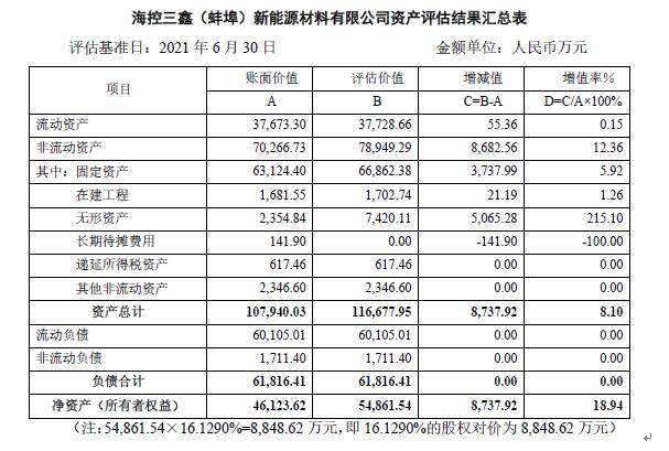 五、評估范圍:??厝危ò霾海┬履茉床牧嫌邢薰窘刂?021年6月30日經(jīng)審計(jì)后資產(chǎn)負(fù)債表中反映的全部資產(chǎn)和負(fù)債,即總資產(chǎn)107,940.03萬元,總負(fù)債61,816.41萬元,凈資產(chǎn)46,123.62萬元。