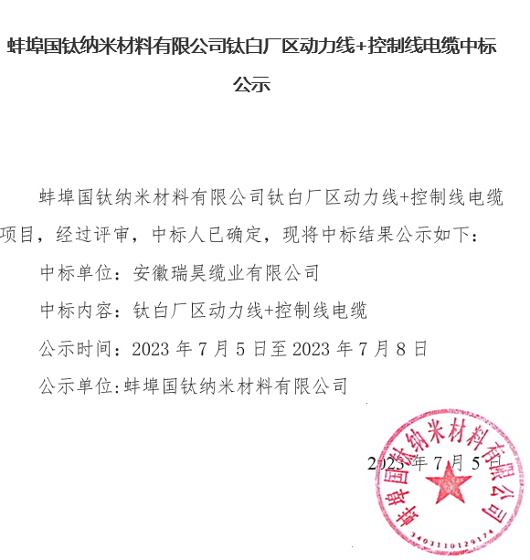 蚌埠國鈦納米材料有限公司鈦白廠區(qū)動力線+控制線電纜中標(biāo)公示